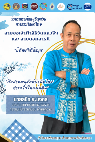 ? นายสนิท ยะมงคล ประธานคณะกรรมเครือข่ายกองทุนแม่ของแผ่นดิน อำเภอภูซาง และผู้ใหญ่บ้านหนองเลา หมู่ 8 ตำบลภูซาง อำเภอภูซาง จังหวัดพะเยา ร่วมรณรงค์และเชิญชวนการใช้และการสวมใส่ผ้าไทย ลายขอเจ้าฟ้าสิริวัณณวรีฯและ ลายดอกสารภี ดอกไม้ประจำจังหวัดพะเยา “ผ้าไทยใส่ให้สนุก” เพื่อส่งเสริมการใช้และสวมใส่ผ้าไทยพื้นถิ่น กระตุ้นและส่งเสริมเศรษฐกิจฐานราก ร่วมสืบสานอนุรักษ์ศิลป์ ผ้าถิ่นไทย ดำรงไว้ในแผ่นดิน
